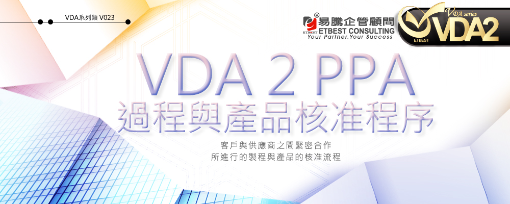 [課程說明] ■VDA為了汽車供應鏈中客戶對供應商的要求在全球範圍有相同的品質管制標準 , 在1975年起建立了VDA 2,目前最新為2020年版! ■越來越緊密的汽車供應鏈合作關係直接影響到供應鏈的全球競爭力; VDA 2做為客戶與供應商之間緊密合作所進行的製程與產品的核准流程。 ■PPA (Production Process and product approval) [課程特色] ■清楚說明VDA 2核准程序 ■新版要求-觸發矩陣說明 ■透過提交案例討論深入了解PPA與PPAP的異同點
