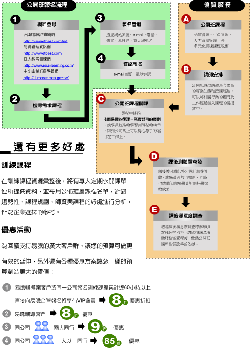 訓練課程特色: ◆ 公開班課程特色 環顧市面上那麼多的教育訓練機構,您曾經上過的課程,您又學到些什麼? 易騰企管瞭解這些教育訓練的缺失,特別聘請在企業界實務經驗豐富,