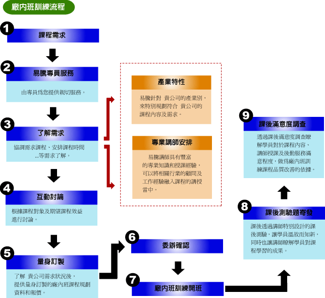 訓練課程特色: ◆ 廠內班課程特色 廠內班課程結合各公司的管理系統及現狀,講師有針對性的製作教材和案例,有利於學員更好地學習 和運用於實際工作。講師具有豐富的專業知識和授課經驗,可以將相關行業的顧問及工作經驗融入課程的 講授當中。通過講師的專業經驗,真正為貴公司帶來經營效益,包含: (1) 在貴公司宣導先進的生產管理、品質管理和人力資源管理的知識,提升管理幹部與職工的品質意識和 進行生產活動所需的技能。